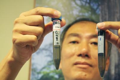 臺灣成功大學研發(fā)團隊6日公布研發(fā)的乳化重油節(jié)能技術,一旦普及,全臺灣年省油費300億元新臺幣。圖左試管為成功混合的乳化重油,右方試管是混合失敗的重油。(“中央社”圖)