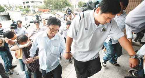 臺灣職棒米迪亞暴龍隊涉嫌打假球,板橋地檢署在偵訊后,暴龍隊老板施建新遭到檢方飭回,教練吳昭輝(右一)、施建新特助郭德志(右二)等六人遭到收押。(圖片來源:臺灣《聯(lián)合報》)