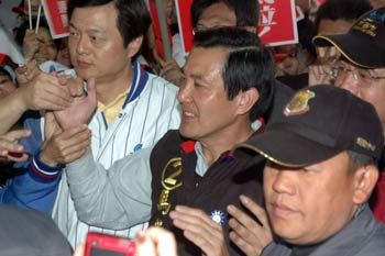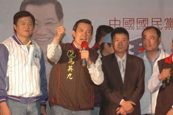 國(guó)民黨候選人馬英九(左二)21日在臺(tái)北縣掃街前表示,因?yàn)檫x民手中的一票,決定臺(tái)灣的未來(lái)。一向挺綠的坪林鄉(xiāng)長(zhǎng)王潮清(右二)也在馬英九見證下加入國(guó)民黨,讓藍(lán)營(yíng)士氣大振。