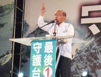 民進(jìn)黨“副總統(tǒng)”候選人蘇貞昌20日在高雄市“最后一席、守護(hù)臺(tái)灣”造勢(shì)晚會(huì)批評(píng)對(duì)手陣營(yíng)的主張。