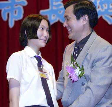 2001年6月2日,也就是7年前馬元中在龍山中學(xué)的畢業(yè)典禮,領(lǐng)的是市長獎(jiǎng),巧的是頒獎(jiǎng)人就是爸爸馬英九,上臺(tái)時(shí)馬元中先喊了聲爸爸,活潑又顯得有些尷尬,感性的馬英九要女兒親一下,被小女兒連續(xù)拒絕2次,完全不給爸爸面子。