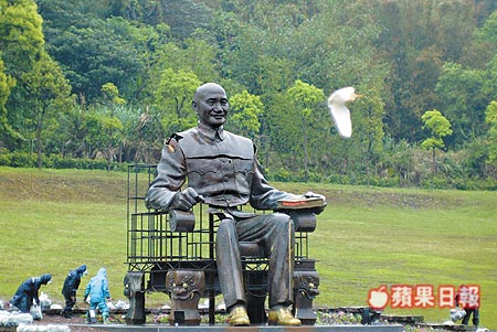 1年前在高雄市被拆除的蔣介石銅像,將較完整的117塊重組,放置慈湖紀(jì)念雕塑公園里,經(jīng)過(guò)拋光處理的鞋,象征走出新路。