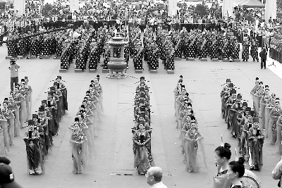 上午9點(diǎn)半,此次活動(dòng)的重頭戲——保生大帝頌典儀式開始。在數(shù)通鳴鐘響鼓之后,兩列身著錦衣、手持斧鉞的古裝衛(wèi)士沿著石階緩緩而下,海滄青礁慈濟(jì)宮理事長呂根銓、臺(tái)灣保生大帝信仰總會(huì)創(chuàng)會(huì)理事長廖武治作為主祭人,率領(lǐng)290座各地宮廟代表,在保生大帝神像前開始隆重的頌典儀式。詠?zhàn)x頌文、獻(xiàn)花獻(xiàn)果、贊唱,吸收了祭孔、祭黃帝和祭媽祖的保生頌典儀式,讓現(xiàn)場(chǎng)的兩岸鄉(xiāng)親大飽眼福。頌典儀式上還進(jìn)行了充滿懷古思緒的歌舞表演,身著多彩輕紗的舞者翩翩起舞,幾十人的古裝儀仗隊(duì)整齊排列于兩旁,盡顯盛大莊重的氣氛,也向現(xiàn)場(chǎng)所有來賓展示了中華文化的禮儀和鮮活的民俗文化。