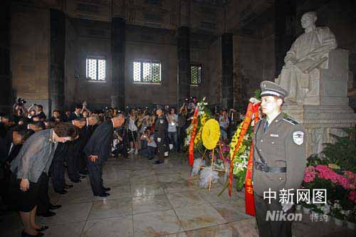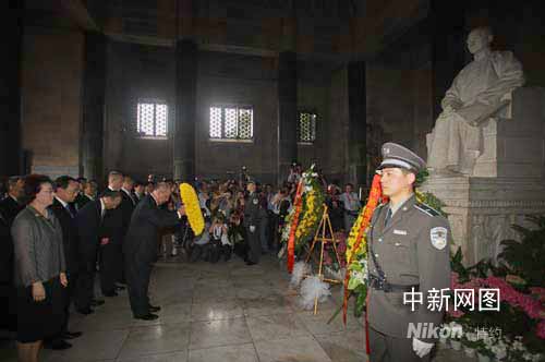 中新網(wǎng)5月27日電 中國(guó)國(guó)民黨主席吳伯雄率領(lǐng)中國(guó)國(guó)民黨訪問團(tuán)今天(27日)上午8時(shí)20分左右抵達(dá)南京中山陵,隨后舉行拜謁儀式,向?qū)O中山先生坐像敬獻(xiàn)花圈、宣讀祭文、行鞠躬禮。