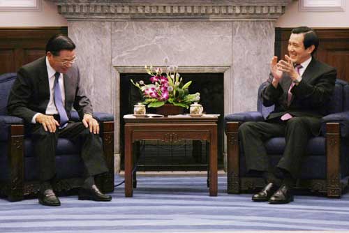 馬英九(右)六月九日接見;鶗(huì)董事長(zhǎng)江丙坤等即將前往大陸協(xié)商的代表團(tuán)成員。(“中央社”圖)