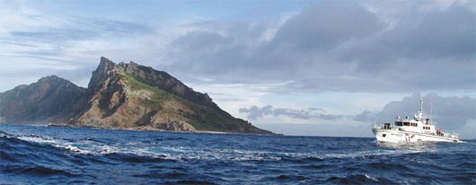 “全家福”距釣魚島還有40海里時(shí)(約74公里),日本巡邏艦以跑馬燈警告,要求“全家!备淖兒较。4時(shí)53分,載著保釣人士的“全家!保伞昂Q彩稹迸炌ёo(hù)衛(wèi)進(jìn)入釣魚島12海里處,臺(tái)日船艦劍拔弩張。