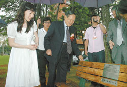 演講結(jié)束,翁帆慢步走上講臺,大方地與與楊振寧站在一起,與簇?fù)淼膶W(xué)生合照,然后一起開心地手牽手前去為諾貝爾大師椅揭幕。這時天空飄起細(xì)雨,“小心啊,地滑!”翁帆提醒楊振寧,兩人臉上帶著笑意,也卸除了大學(xué)師生對“大師”兩個字的恐懼。