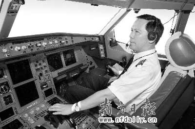 南航董事長(zhǎng)劉紹勇機(jī)長(zhǎng)在檢查首航飛機(jī)的狀態(tài)。