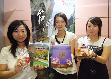 大陸觀光首發(fā)團(tuán)四日抵臺(tái),桃園縣也前往桃園機(jī)場(chǎng)宣傳桃園之美,其中包括宣傳大溪豆干、龍?zhí)敦曁恰⒋群^光導(dǎo)覽!爸醒肷纭眻D