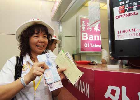 大陸觀光首發(fā)團(tuán)四日來(lái)臺(tái),廣東旅客拿人民幣兌換新臺(tái)幣時(shí),心情相當(dāng)興奮!爸醒肷纭眻D
