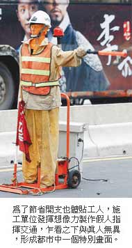 除了假警察之外,施工單位也常常擺出手持指揮棒的假工人,藉以提醒車輛改道,除了可以節(jié)省人力,還可以避免因駕駛?cè)瞬簧髟斐傻娜松韨觥?/p>