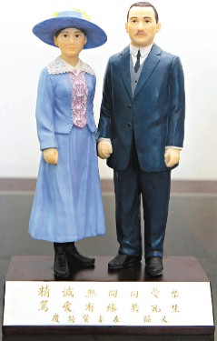 孫宋公仔模型上刻有“精誠無間同憂樂、篤愛有緣共死生”字樣。邵銘煌解釋,這是當(dāng)年孫中山寫給宋慶齡的情詩,看得出兩人情深意濃。