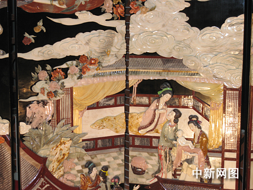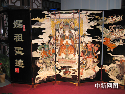 中新網(wǎng)10月25日電 圖為位于中國閩臺緣博物館內(nèi)的巨幅玉石鑲嵌《媽祖》。作品高2米,長30米,歷時5年,采用天然玉、石、珍珠、瑪瑙、翡翠、鉆石鑲嵌。該畫根據(jù)《敕封天后志》、《天后顯圣錄》以及民間有關媽祖?zhèn)髡f繪成,以連續(xù)不斷的立體與浮雕畫面展現(xiàn)了媽祖救海難、護使節(jié)、解旱治病的圣跡。