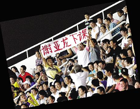 謝亞龍作為中國足協(xié)的一把手,在其任期內(nèi)也是語錄翻新不斷,從亞洲兵敗的吟詩:“恨不抗日死,留作今日羞。國破尚如此,我何惜此頭”到女足奧運無緣四強之后說:“女足該練練叉腰肌!辈贿^,語錄再多也不能當(dāng)球踢,國足和國奧糟糕的戰(zhàn)績讓中國球迷們?nèi)虩o可忍,在很多地方打出了“謝亞龍下課”的標(biāo)語,而在北京奧運會期間,這句話更取代了“加油”的助威聲。