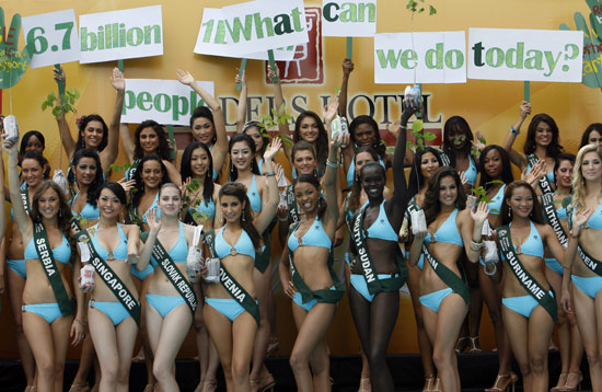 10月28日,在菲律賓首都馬尼拉,參加2008年地球小姐大賽的佳麗在媒體見面會(huì)上展示泳裝。來自全球的85位佳麗將于11月9日在馬尼拉角逐以“綠色生活方式”為主題的2008年地球小姐大賽桂冠。