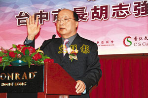 中新網(wǎng)12月19日電 臺中市長胡志強18日在香港香江文化交流基金會午餐會發(fā)表演講,提出加強臺中、香港、廈門的經(jīng)濟文化交流,建設南峽(臺灣海峽南部)金三角經(jīng)濟區(qū)。