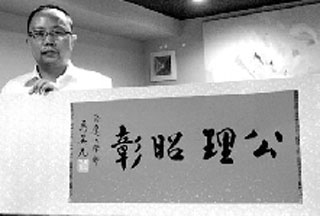 中新網(wǎng)4月21日電 廈門一位普通的律師張海鷹近日得到馬英九的親筆題詞。這幅題有“公理昭彰”四字的1米長(zhǎng)卷是馬英九對(duì)張海鷹多年幫助臺(tái)商的謝禮。