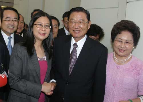 ;鶗麻L江丙坤(中)十一日啟程前往北京與海協(xié)會展開中斷九年的協(xié)商,臺灣“陸委會”主委賴幸媛(前左)前來送機。( “中央社”圖)