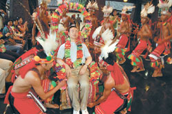 大陸踩線團(tuán)團(tuán)長(zhǎng)范貴山,被當(dāng)成臺(tái)灣少數(shù)民族大頭目,接下許愿酒,連干三杯,許下北京奧運(yùn)成功、兩岸旅游“火火紅紅”、兩岸人民幸福美滿等三個(gè)愿望。
