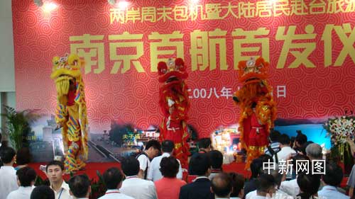 中新網(wǎng)南京7月4日電(記者 丁梅 朱曉穎)伴隨喧天的鑼鼓聲,三只金黃、大紅“獅子”跳上舞臺。今日早晨七點,兩岸周末包機南京首航暨大陸居民赴臺旅游首發(fā)儀式在南京祿口國際機場隆重舉行。