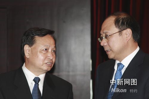 羅清泉(左)與國(guó)臺(tái)辦常務(wù)副主任鄭立中交談。張暢 攝