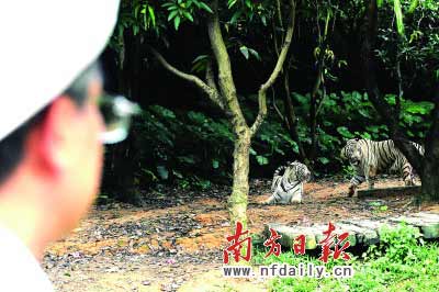 準(zhǔn)備送給高雄的兩只白虎為一公一母,公的叫“昭海”,母的叫“歡樂”?吹娇腿藖砹,“昭!焙汀皻g樂”不時(shí)站起來走幾步,秀秀身材;又不時(shí)把臉朝向觀眾,配合鏡頭。訪問團(tuán)成員紛紛站到鏡頭前,與兩只白虎來個(gè)“遠(yuǎn)距離合照”。