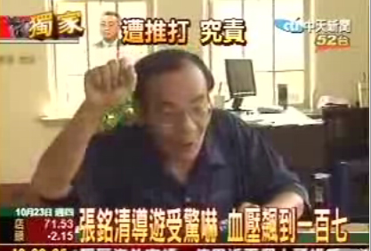 海協(xié)會(huì)副會(huì)長(zhǎng)張銘清在臺(tái)遭襲事件,不但令國(guó)際震驚,就連臺(tái)南人自己也被嚇了一大跳。據(jù)臺(tái)灣中時(shí)電子報(bào)23日消息稱,當(dāng)天擔(dān)任張銘清在孔廟的導(dǎo)游的江文章,說(shuō)自己當(dāng)時(shí)被嚇得腦袋一片空白,后來(lái)量血壓,竟然發(fā)現(xiàn)血壓飆高到170。