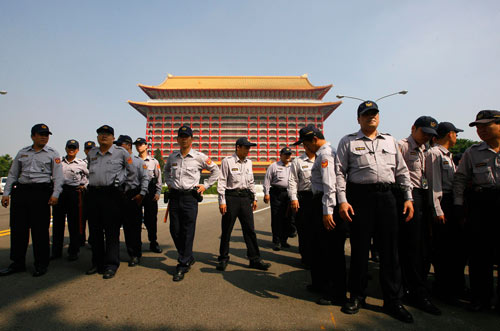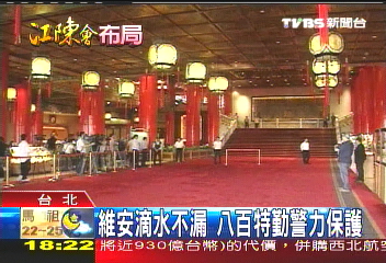 據(jù)臺灣TVBS報道,這回光是警力,“警政署”就動員七千人次負責安全。從飯店牌樓,一直到大廳,都有便衣刑警站崗,同時后方的停車場,還有支持保警24小時待命。