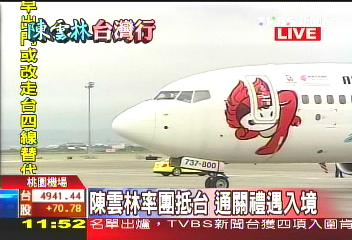 報(bào)道說,臺(tái)灣海基會(huì)副董事長兼秘書長高孔廉率領(lǐng)臺(tái)方的接待人員在停機(jī)坪接機(jī)。陳云林在機(jī)場禮遇通關(guān)直接驅(qū)車前往下榻的圓山飯店。