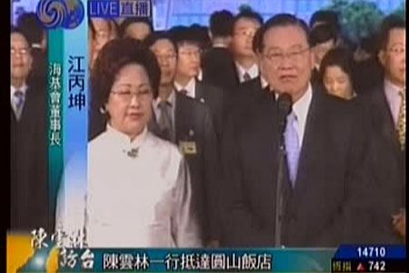 剛剛我在電視上看到11點58分,陳會長、陳夫人踏上臺灣寶島這塊地上,這一刻,不只是臺灣的民眾在看、大陸的民眾在看,全世界都在看。因為,這是歷史的一刻,在兩岸交流史上,這一刻整整花了60年;在兩會成立以來,也是歷史性的一刻,是第一次在臺北舉行兩會的會談;對兩岸關系的發(fā)展,也是關鍵的一刻。因為,它是兩岸和平經濟雙贏的重要的一步。