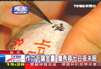 中新網(wǎng)11月4日電 臺北“江陳會談”今天舉行,臺灣;鶗䴗(zhǔn)備了鑲有6000金字的“和平協(xié)商,共創(chuàng)雙贏”的藝術(shù)字畫,送給陳云林。據(jù)臺灣TVBS報道,字畫創(chuàng)作者、臺灣藝術(shù)家詹秀蓉透露,為了這幅字畫,她不眠不休花了7天時間,才在最后一刻完成。不過,見證兩岸歷史時刻,詹秀容說,她與有榮焉,所以分文不取。