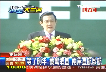 馬英九說:“兩岸直航所代表的意義,一方面代表兩岸的和解,不再走過去對立沖突的路線,也就是說,我們用談判取代對立,以和解取代沖突,兩岸共同謀求和平與繁榮。而從經(jīng)濟(jì)面來看,兩岸直航,在空運(yùn)方面可節(jié)省大量時(shí)間,估計(jì)超過30億元,在海運(yùn)方面也是一樣,每一個(gè)航次可節(jié)省16到27個(gè)小時(shí)!