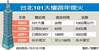 另外,從2004年一○一大樓首次施放跨火煙火至今,公部門并未補助任何經(jīng)費,股東們也有意見,都是一○一大樓無法繼續(xù)施放跨年煙火的原因。