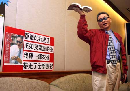 中新網(wǎng)11月21日電 無(wú)黨籍“立委”李敖20日告別政壇,他留下來(lái)的代表作就是他的新書(shū)“議壇哀思錄”,取這個(gè)名字,李敖說(shuō),就是指別人都死了,只有他還活著。書(shū)中還大爆“立院”同僚們的料,像是未婚的女“立委”李紀(jì)珠還是處女,而邱毅在“上床”前,還要先讀他的著作。