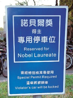 這個專屬停車位,位在臺大小椰林大學旁的“中研院”原分所后方。停車位旁還樹立了一個醒目的標示牌,藍底白字用中英文寫著“諾貝爾獎得主專用停車位”,上頭還注明“需經(jīng)特別核準后使用,違車將被鎖車”。