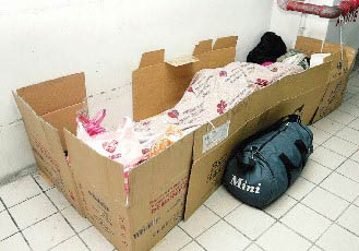 中新網(wǎng)2月15日電 寒流連日來(lái)襲,臺(tái)北市一度掉到攝氏六七度,使得大批游民涌入臺(tái)北火車(chē)站避寒。原本約僅數(shù)十名游民“駐地”的臺(tái)北火車(chē)站,這幾天一下子爆增到兩百多人。不少游民用厚紙板搭成簡(jiǎn)陋帳篷御寒,雜物散置一地,使得臺(tái)北火車(chē)站一些角落仿佛“難民營(yíng)”。