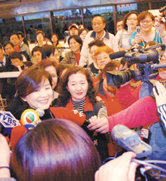 林青霞就是不一樣,人還未出關,先行通關的民眾已交頭接耳,“很水(漂亮)哦”、“穿大紅色,美女啦”,待她一現(xiàn)身很多粉絲干脆不走了,有人拿出珍藏多年“窗外”海報請她簽名,還有人把“東方不敗”劇報帶來,林青霞感動得大叫:“你們怎么有這些?”巨星看來比粉絲還興奮且激動。