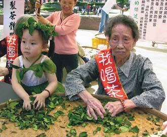 102歲茶農(nóng)楊許好從花蓮趕來示范揉茶,他前一陣子排尿不順,開始每天喝茶3杯,排尿不順的癥狀就改善許多。與楊許好一同示范揉茶還有4歲女童江宜庭,她從2歲就喝茶,經(jīng)常與母對飲,樂在其中。