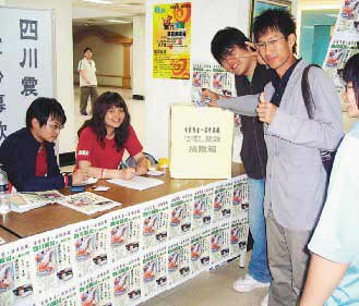 中新網(wǎng)5月22日電 “10元、百元不嫌少,援助災(zāi)民要趁早!”四川震災(zāi),讓來自南投九二一災(zāi)區(qū)的玄奘大學(xué)教育人力資源系學(xué)生蕭楷庭感同身受,學(xué)生社團發(fā)起愛心救災(zāi),他毫不猶豫捐了1000元(新臺幣,下同)的零用錢。