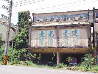 在苗栗縣三灣往南莊風(fēng)景區(qū)路上,有棟廢棄建物墻上仍保留“建設(shè)臺(tái)灣,光復(fù)大陸”的斗大標(biāo)語,字跡斑駁,卻引人注目。有人認(rèn)為這些標(biāo)語早已過時(shí),大陸客來臺(tái)有極大商機(jī),不必造成大陸客不快,建議涂銷;但也有人認(rèn)為這是當(dāng)年軍隊(duì)轉(zhuǎn)進(jìn)來臺(tái)時(shí)的標(biāo)語,是兩岸敵對(duì)狀況的歷史見證,頗具懷舊風(fēng)味,應(yīng)該保留。