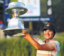 中新網(wǎng)6月13日電 臺灣高爾夫女將曾雅妮,剛剛拿下美國女子職業(yè)高爾夫LPGA四大賽冠軍,這位19歲的女孩在接受TVBS訪問時說她從小就愛打高爾夫,每天都吵著要去練球,她還開心地向記者展示家中的花籃。