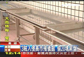 有竊賊趁半夜侵入殯儀館,一口氣偷走了幾十塊尸盤。高雄市殯儀館方面稱,小偷“拿大剪把鎖剪掉再進去,每人拿一塊尸盤出來!边B停放尸體的尸盤都趕偷,員工說,這竊賊實在有夠大膽。