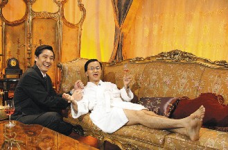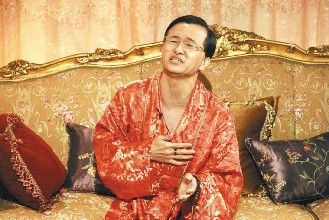 本來就跟馬英九長(zhǎng)得像的張明興,也是“寶來秘密花園”中的?,每次劇情都安排“馬英久”深夜造訪匾家,兩人共商“國(guó)事”。教馬英久“一哭二跪三愛臺(tái)”三招。阿匾說“不管是對(duì)付老婆還是對(duì)付選民,只要你一落下男兒淚馬上管用,如果哭不出來,就用生理食鹽水,如果用哭的還不行,那就當(dāng)場(chǎng)跪下,最后再使出大絕招高喊‘愛臺(tái)灣’!”