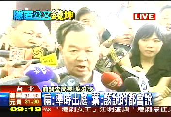 中新網(wǎng)9月5日電 前臺灣“調(diào)查局長”葉盛茂在今天(5日)上午9點15分左右抵達(dá)臺北地檢署,出席9點半召開的偵查庭。葉盛茂在抵達(dá)時透過媒體喊話表示:“我今天會坦然面對、具體陳述,也會充分配合!
