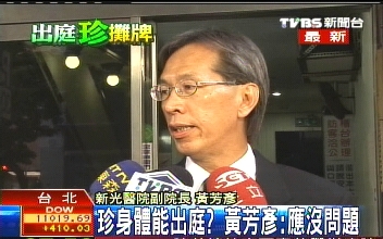 據(jù)臺(tái)灣TVBS報(bào)道,黃芳彥說:“法院的準(zhǔn)備都很好,我想都有萬(wàn)全的準(zhǔn)備,因?yàn)槲也皇撬闹髦吾t(yī)師,所以病情我也不了解,也不便多透露,我是她的家庭醫(yī)生,而她的病需要專科醫(yī)生來照顧,我想法院也會(huì)以主治醫(yī)師的意見為意見!