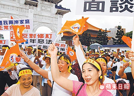 資料圖:2007年是兩岸通婚二十周年,有超過二十五萬名大陸配偶在臺灣生活。但由于當(dāng)局的限制性政策,大陸配偶在島內(nèi)的權(quán)利難以得到保障。07年12月21日,“中華兩岸婚姻協(xié)調(diào)促進(jìn)會”在“移民署”門前集會,申要人權(quán)與平等待遇。 中新社發(fā) 陳國華 攝