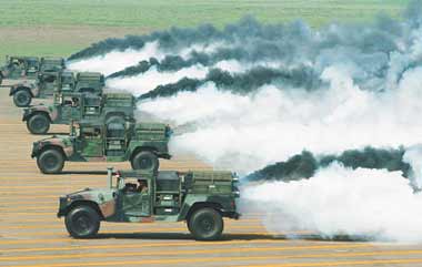 受臺風(fēng)影響,基于安全考慮,空降部隊(duì)無法實(shí)施空降作戰(zhàn),改采地面假想敵誘導(dǎo)實(shí)施,模擬反空降演練,圖為渦輪發(fā)煙車實(shí)施煙幕屏障。