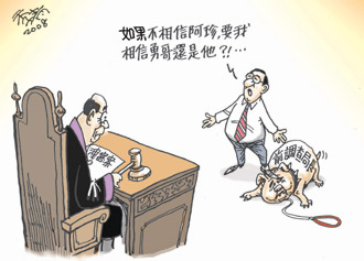 上星期葉盛茂隱匿公文案開庭,陳水扁出庭作證,兩人法庭的互動,又給季青畫“忠狗”的靈感!叭~盛茂對陳水扁卑躬屈膝,陳水扁卻對他不假辭色,還說寧愿相信吳淑珍也不相信‘調(diào)查局’,第二張忠狗畫面就浮現(xiàn)在腦海!”