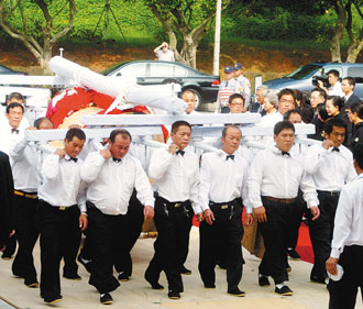 王永慶今天入斂,由24人抬棺,龍巖人本桃園服務處長黨俊明說,抬棺人數(shù)愈多,代表愈慎重,通常火化棺為四人抬棺,土葬棺則是八人起跳,然后是12人、16人等,看棺木大小,24人抬棺應是把引導、后護靈一并計入,否則會太擠,