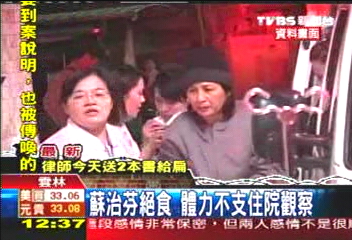 民進(jìn)黨籍云林縣長蘇治芬獄中絕食,已超過250個(gè)小時(shí)沒有吃東西,體力不支,兩度被送到醫(yī)院觀察。圖片來源:臺(tái)灣TVBS